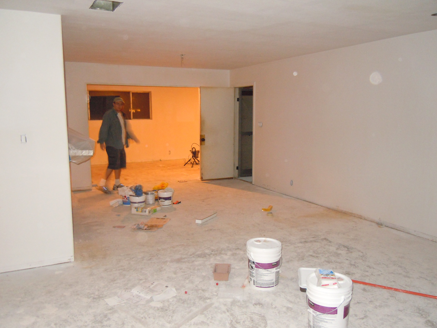 This is a view of the bonus room - primed! (and my buddy the sprayer!)